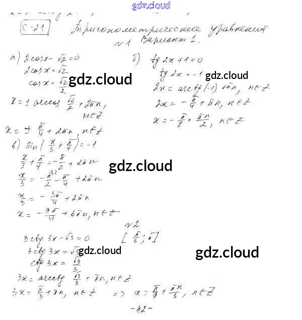СР-21. Тригонометрические уравнения Ответы к Главе 3. Тригонометрические уравнения по Алгебре 10 класс Самостоятельные работы Александрова Базовый уровень Мнемозина