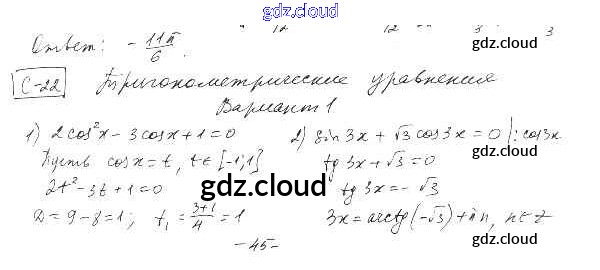 СР-22. Тригонометрические уравнения Ответы к Главе 3. Тригонометрические уравнения по Алгебре 10 класс Самостоятельные работы Александрова Базовый уровень Мнемозина
