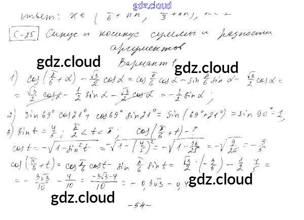 СР-25. Синус и косинус суммы и разности аргументов Ответы к Главе 4. Преобразование тригонометрических выражений по Алгебре 10 класс Самостоятельные работы Александрова Базовый уровень Мнемозина