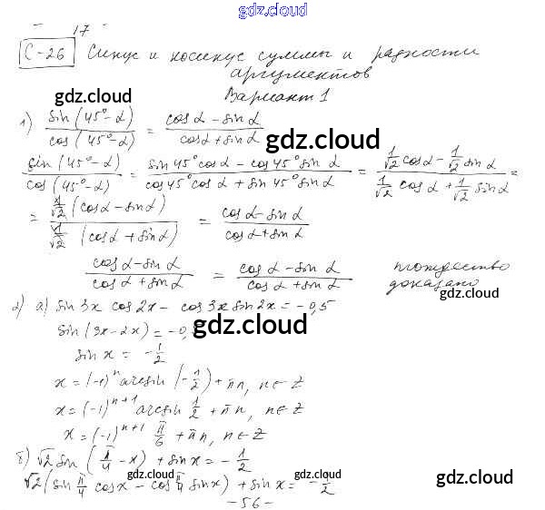 СР-26. Синус и косинус суммы и разности аргументов Ответы к Главе 4. Преобразование тригонометрических выражений по Алгебре 10 класс Самостоятельные работы Александрова Базовый уровень Мнемозина