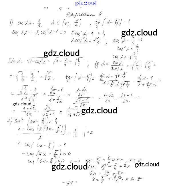 СР-29. Формулы двойного аргумента Ответы к Главе 4. Преобразование тригонометрических выражений по Алгебре 10 класс Самостоятельные работы Александрова Базовый уровень Мнемозина