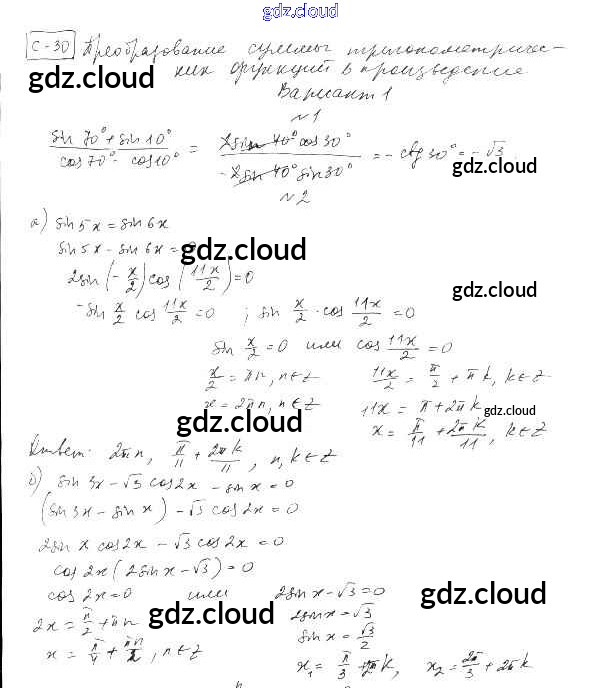 СР-30. Преобразование суммы тригонометрических функций в произведении Ответы к Главе 4. Преобразование тригонометрических выражений по Алгебре 10 класс Самостоятельные работы Александрова Базовый уровень Мнемозина