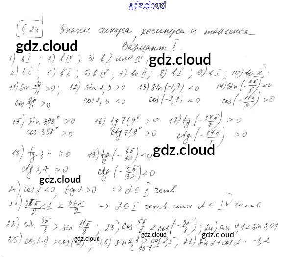 §24. Знаки синуса, косинуса и тангенса Ответы к Главе 5. Тригонометрические формулы по Алгебре 10 класс Дидактические материалы Шабунин Базовый и углубленный уровень Просвещение