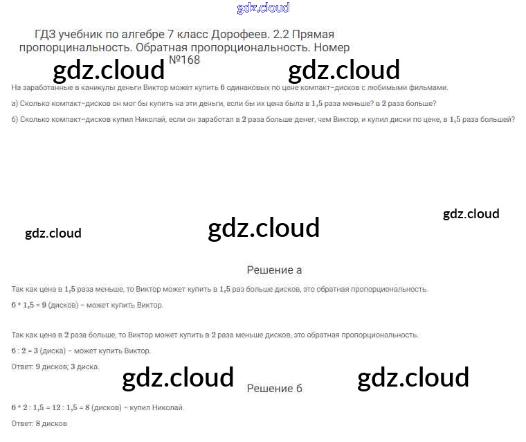 Ответ на задание 168 Учебник Алгебра за 7 (седьмой) класс Дорофеев, Суворова, Бунимович Академический школьный учебник 2020