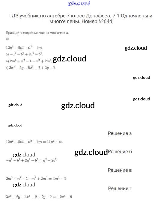 Ответ на задание 644 Учебник Алгебра за 7 (седьмой) класс Дорофеев, Суворова, Бунимович Академический школьный учебник 2020