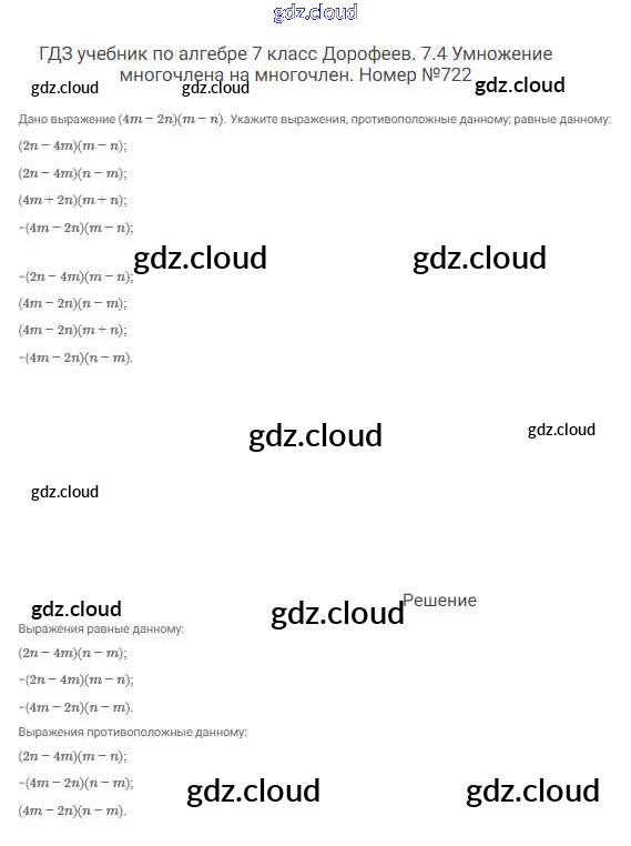 Ответ на задание 722 Учебник Алгебра  за 7 (седьмой) класс Дорофеев, Суворова, Бунимович Академический школьный учебник  2020