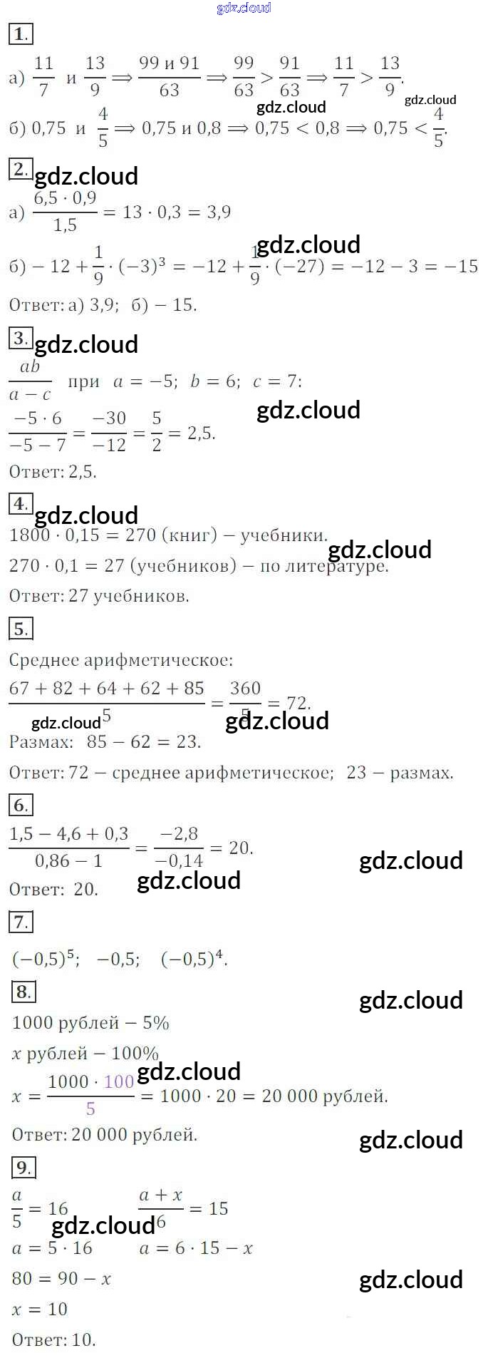 Ответы к Контрольной работе №1. Дроби и проценты  по Алгебре 7 класс Контрольные работы Кузнецова    Просвещение