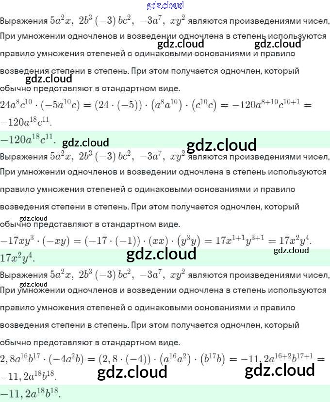 Ответы. §20. Умножение одночленов. Возведение одночлена в степень  по Алгебре 7 класс Рабочая тетрадь Миндюк УМК  Часть 1, 2 Просвещение