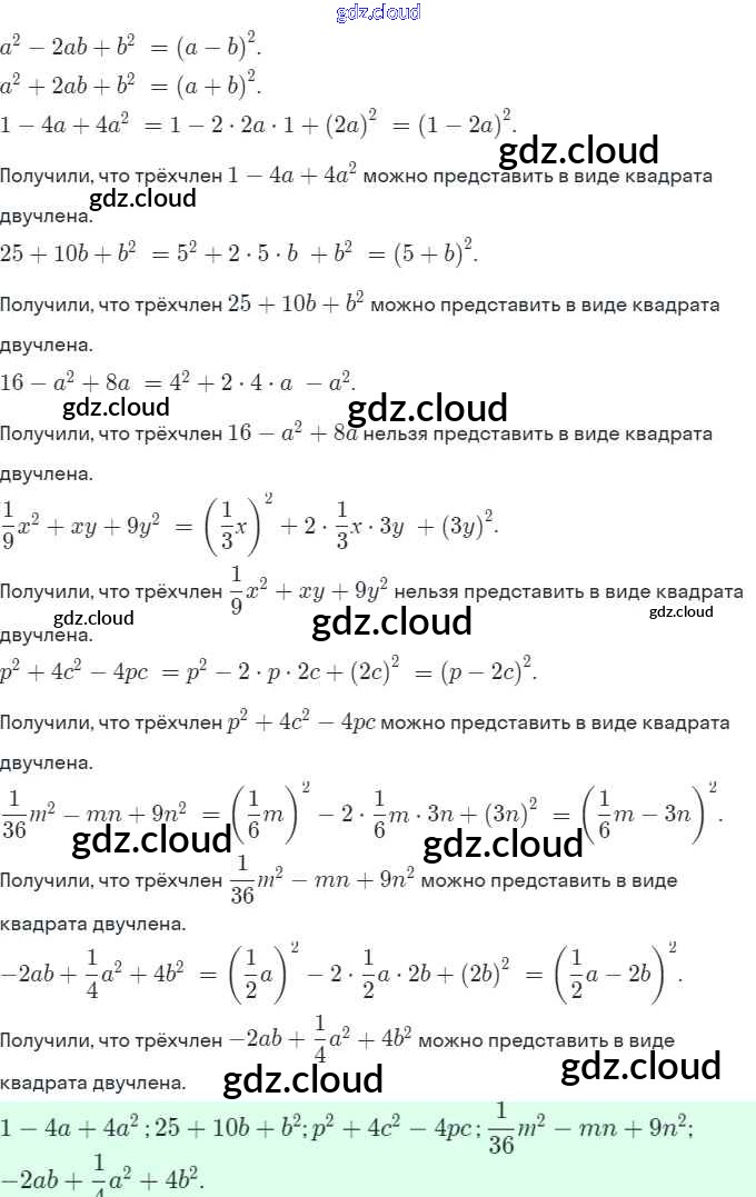 Ответы. §29. Разложение на множители с помощью формул квадрата суммы и квадрата разности  по Алгебре 7 класс Рабочая тетрадь Миндюк УМК  Часть 1, 2 Просвещение