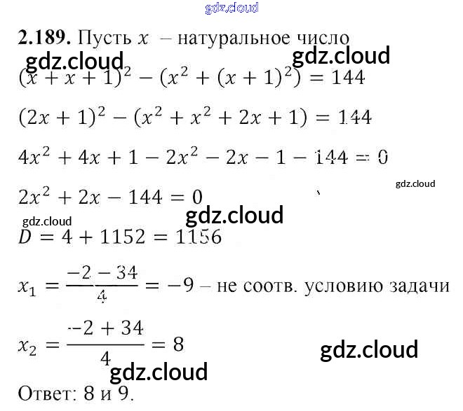 Ответ на задание 2.189 Учебник Алгебра за 8 (восьмой) класс Арефьева, Пирютко 2018 ФГОС онлайн и без номера телефона.