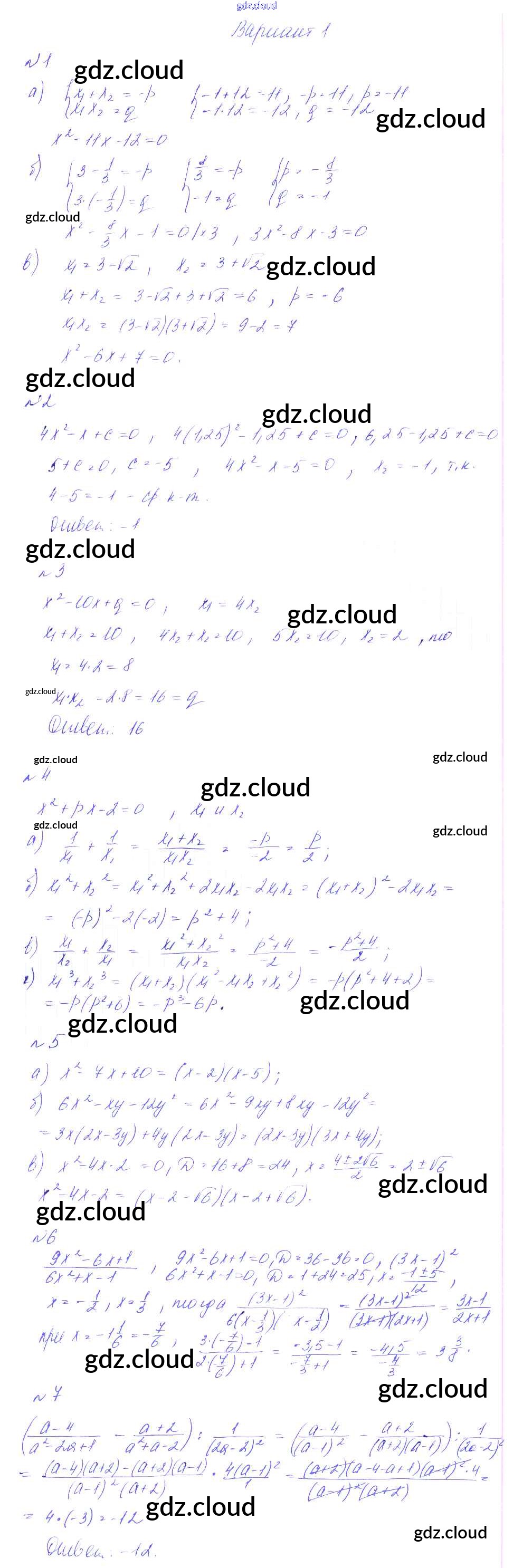 СР-15. Свойство корней квадратного уравнения, симметрические многочлены, разложение квадратного трехчлена на множ Ответы к Самостоятельным работам по Алгебре 8 класс Дидактические материалы Феоктистов Мнемозина