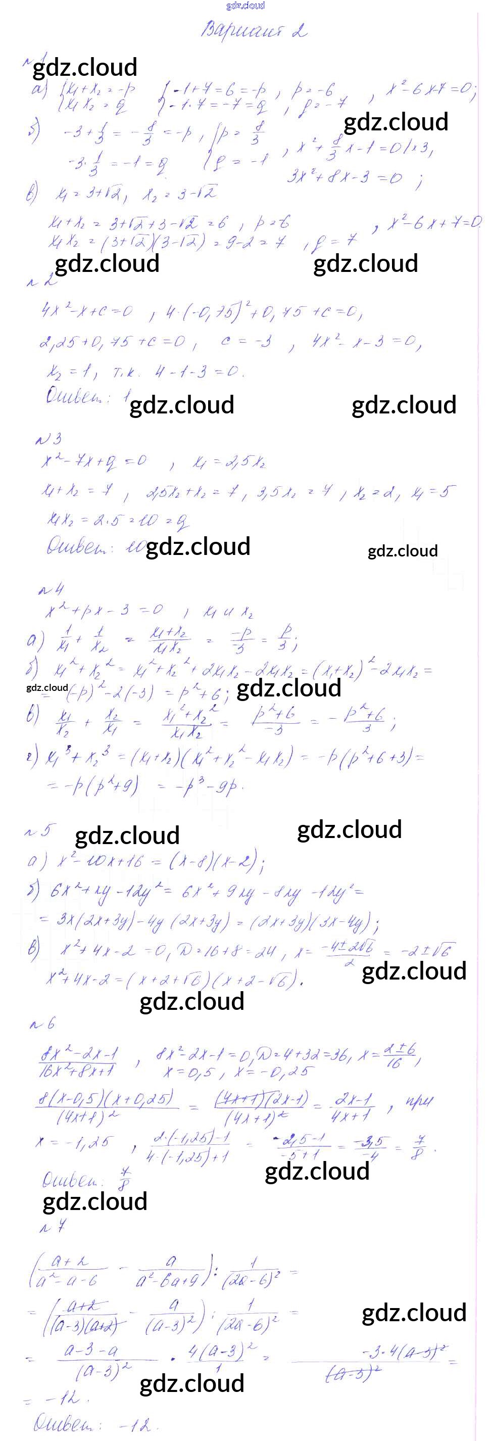 СР-15. Свойство корней квадратного уравнения, симметрические многочлены, разложение квадратного трехчлена на множ Ответы к Самостоятельным работам по Алгебре 8 класс Дидактические материалы Феоктистов Мнемозина