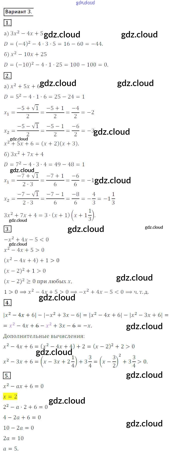 СР №5. Квадратный трехчлен Ответы к Самостоятельным работам по Алгебре 8 класс Дидактические материалы Потапов МГУ - школе Просвещение