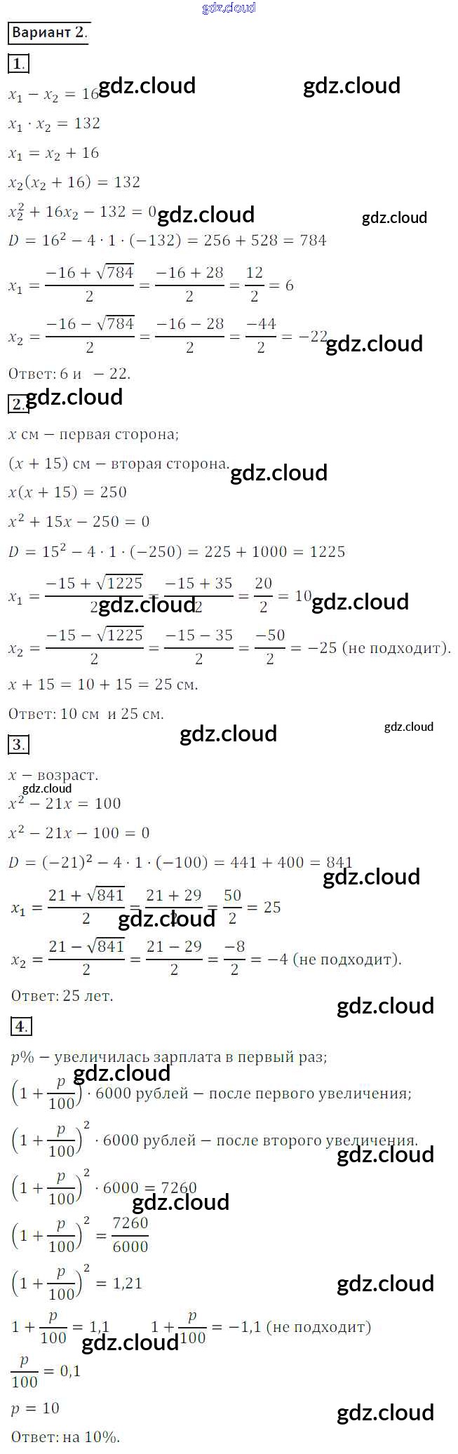 СР №7. Решение задач при помощи квадратных уравнений Ответы к Самостоятельным работам по Алгебре 8 класс Дидактические материалы Потапов МГУ - школе Просвещение