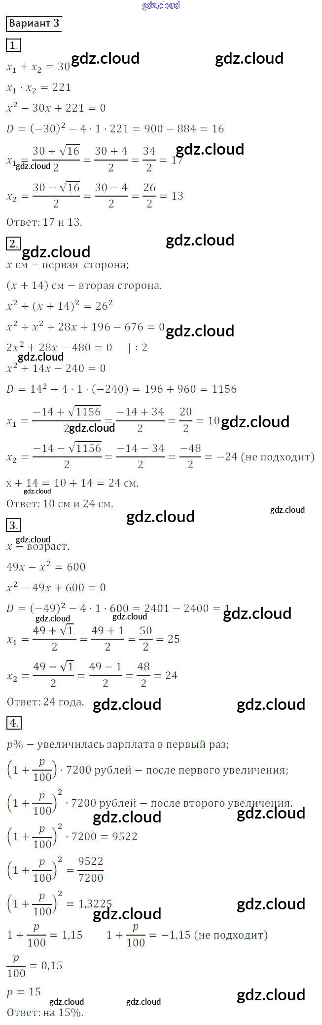 СР №7. Решение задач при помощи квадратных уравнений Ответы к Самостоятельным работам по Алгебре 8 класс Дидактические материалы Потапов МГУ - школе Просвещение