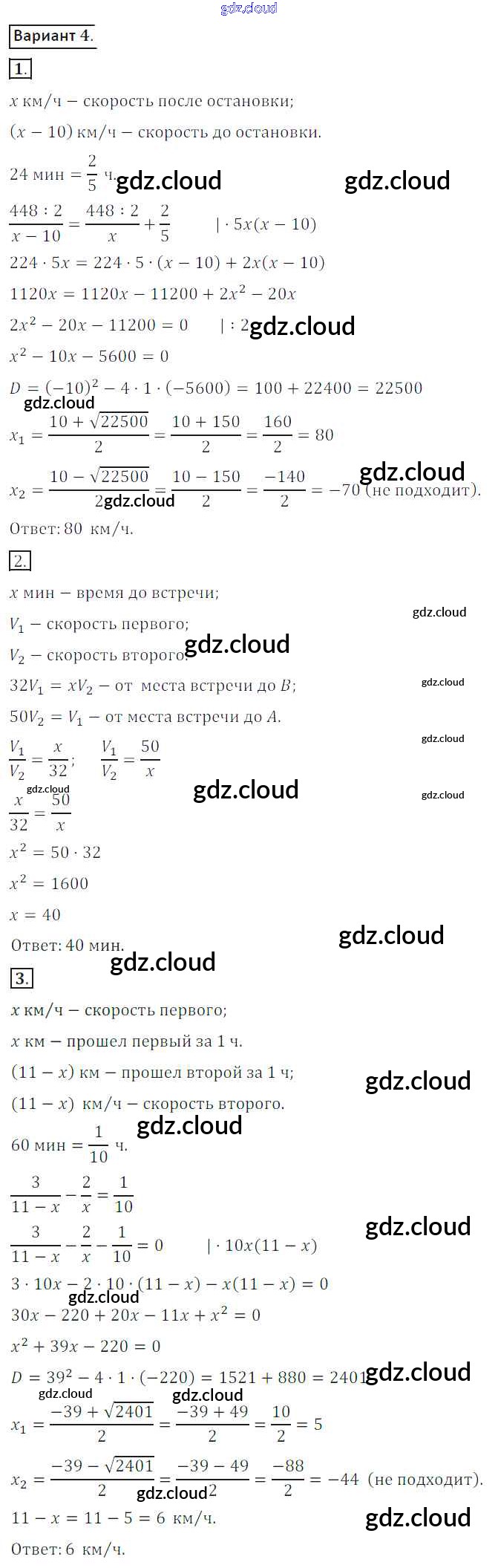 СР №9. Решение задач при помощи рациональных уравнений Ответы к Самостоятельным работам по Алгебре 8 класс Дидактические материалы Потапов МГУ - школе Просвещение