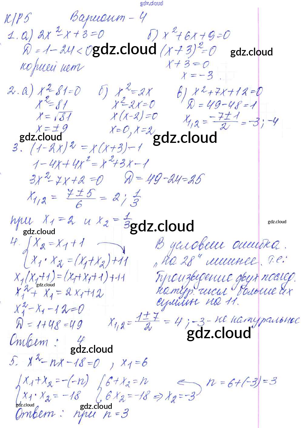 Ответы к КР-5. Квадратные уравнения. Варианты по Алгебре 8 класс Контрольные работы Дудницын УМК Экзамен