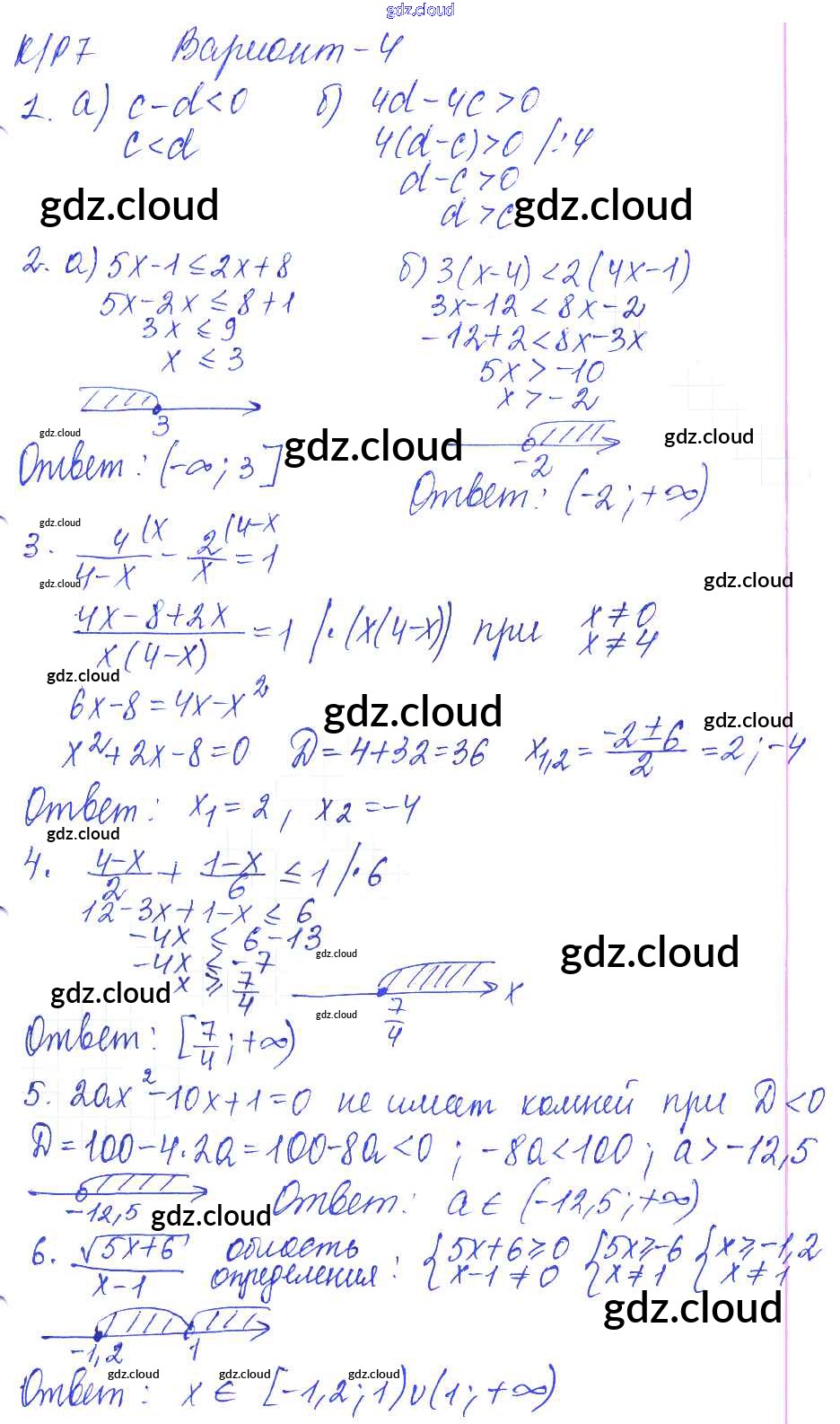 Ответы к КР-7. Неравенства с одной переменной. Варианты по Алгебре 8 класс Контрольные работы Дудницын УМК Экзамен