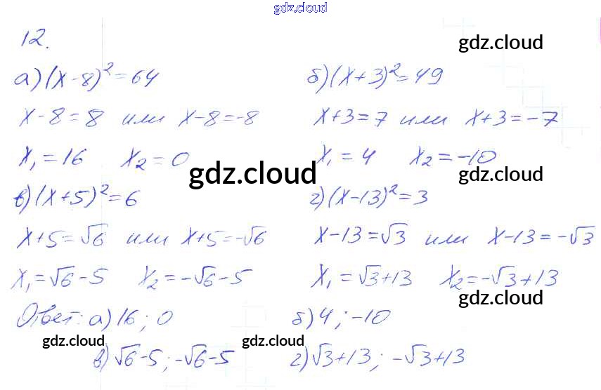 Ответы. §12. Уравнение x^2=a по Алгебре 8 класс Рабочая тетрадь Миндюк УМК Часть 1, 2 Просвещение