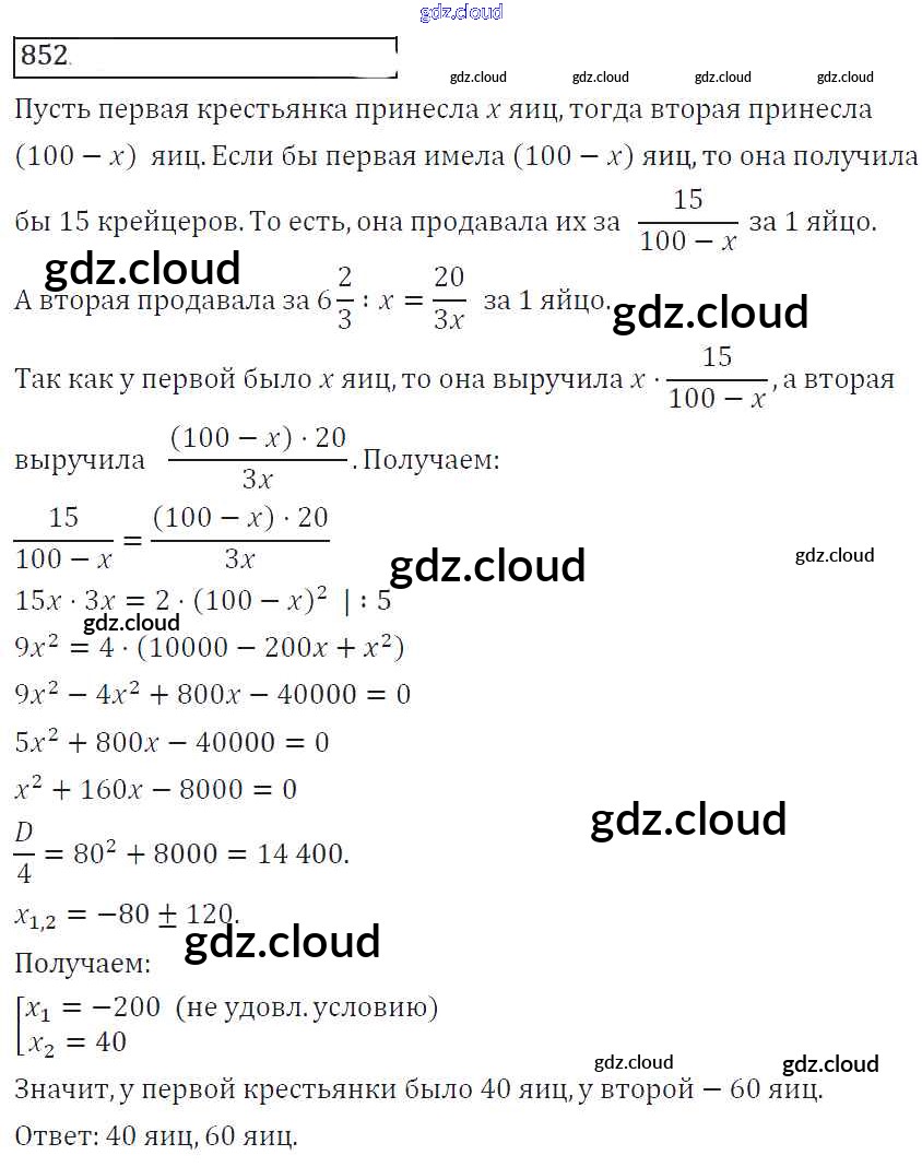 Ответ на задание 852 Учебник Алгебра за 8 (восьмой) класс Колягин, Ткачева, Федорова, Шабунин УМК 2013 ФГОС онлайн и без номера телефона.