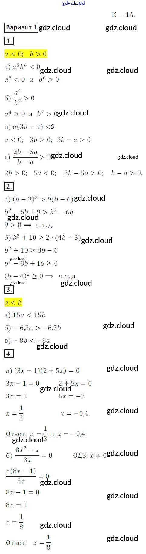 КР №1A Ответы к Контрольным работам по Алгебре 8 класс Дидактические материалы Жохов Просвещение