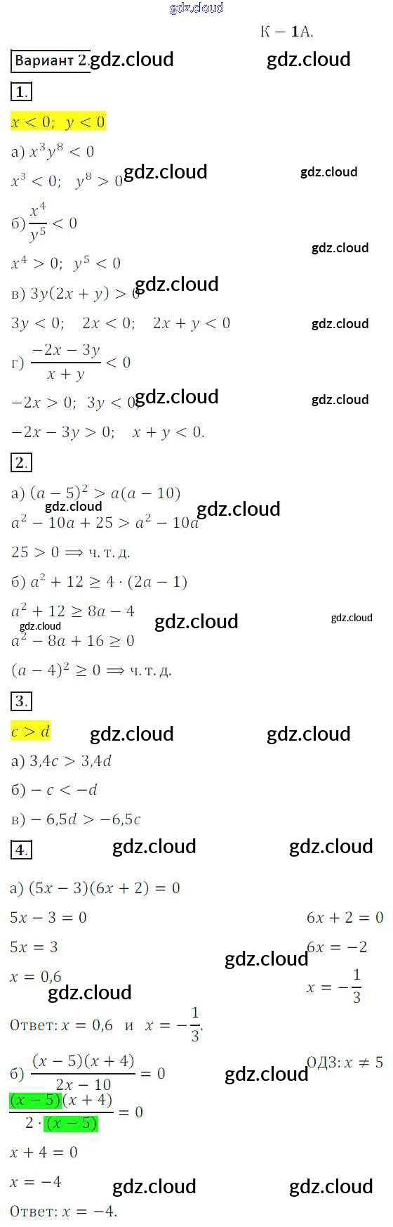 КР №1A Ответы к Контрольным работам по Алгебре 8 класс Дидактические материалы Жохов Просвещение