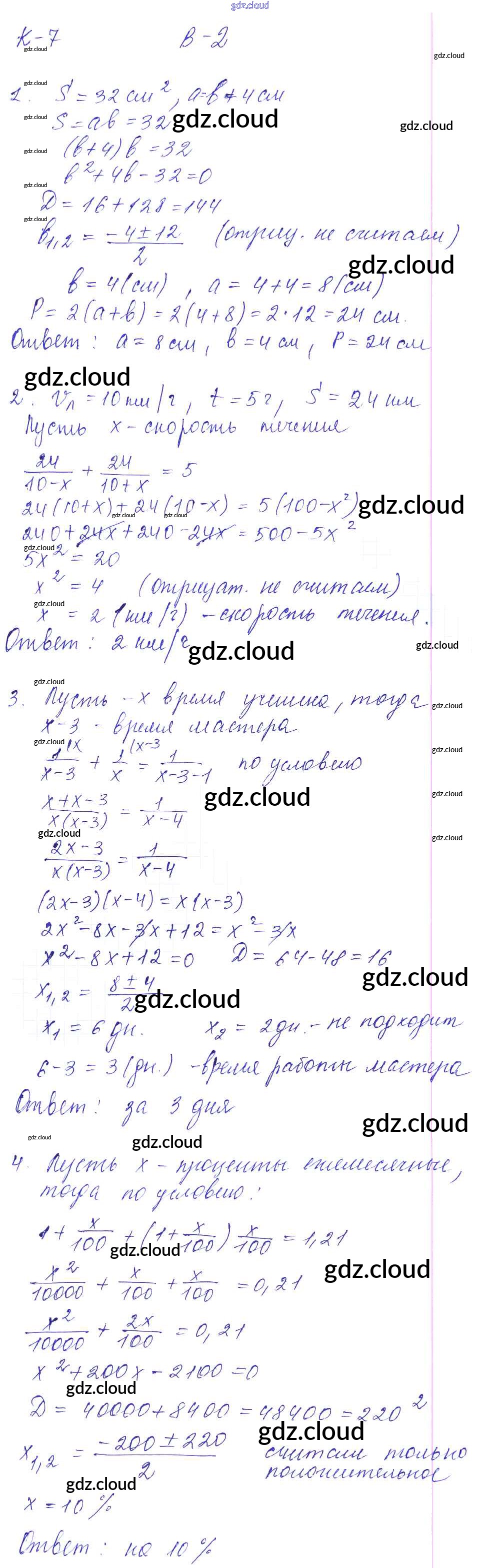 КР-7. Текстовые задачи, сводящиеся к квадратным уравнениям Ответы к Контрольным работам по Алгебре 8 класс Дидактические материалы Звавич УМК Экзамен