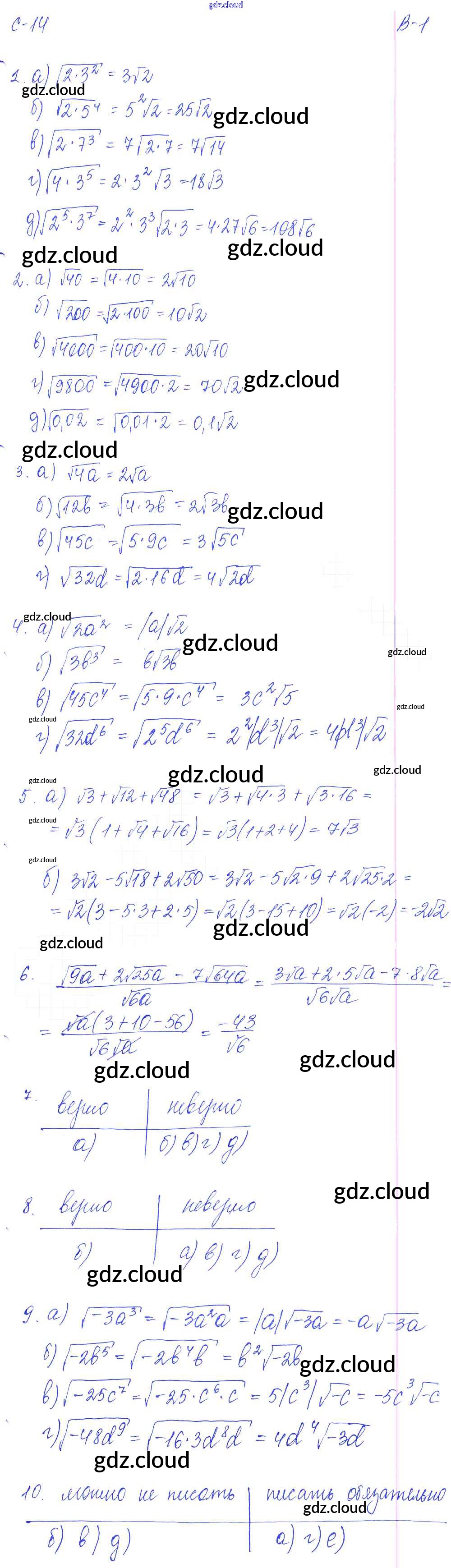 СР - 14. Вынесение множителя из-под знака корня Ответы к Самостоятельным работам. Варианты по Алгебре 8 класс Дидактические материалы Звавич УМК Экзамен