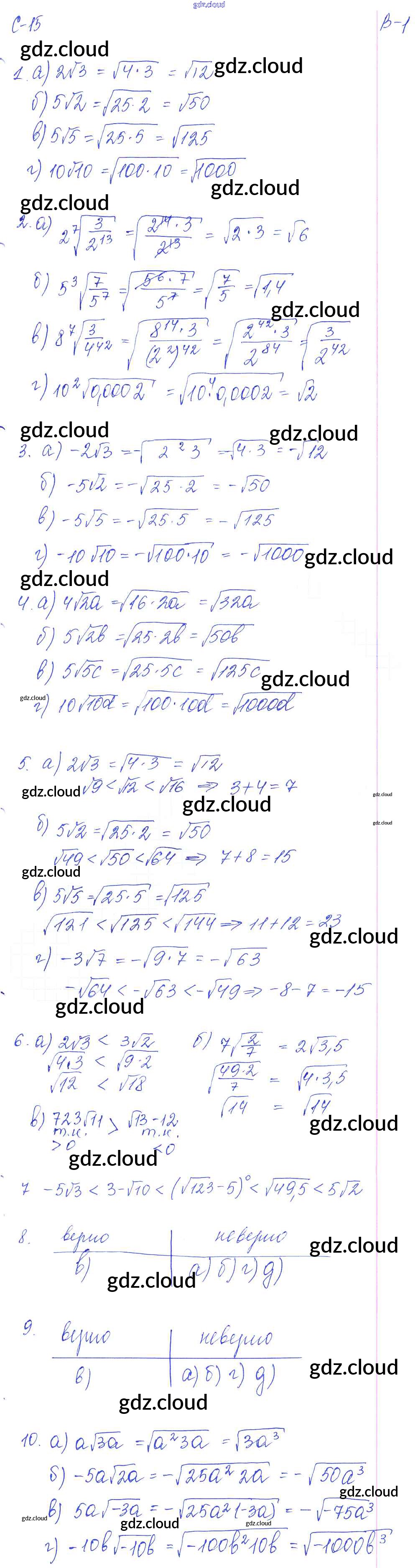 СР - 15. Внесение множителя под знак корня Ответы к Самостоятельным работам. Варианты по Алгебре 8 класс Дидактические материалы Звавич УМК Экзамен