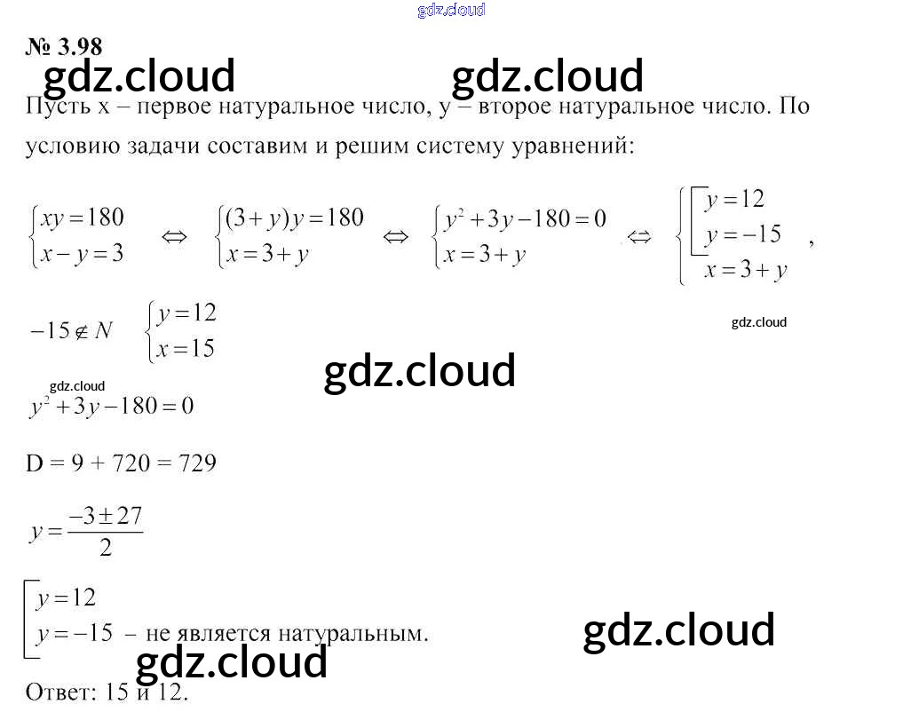 Ответ на задание 3.98 Учебник Алгебра за 9 (девятый) класс Арефьева, Пирютко 2019 онлайн и без номера телефона.