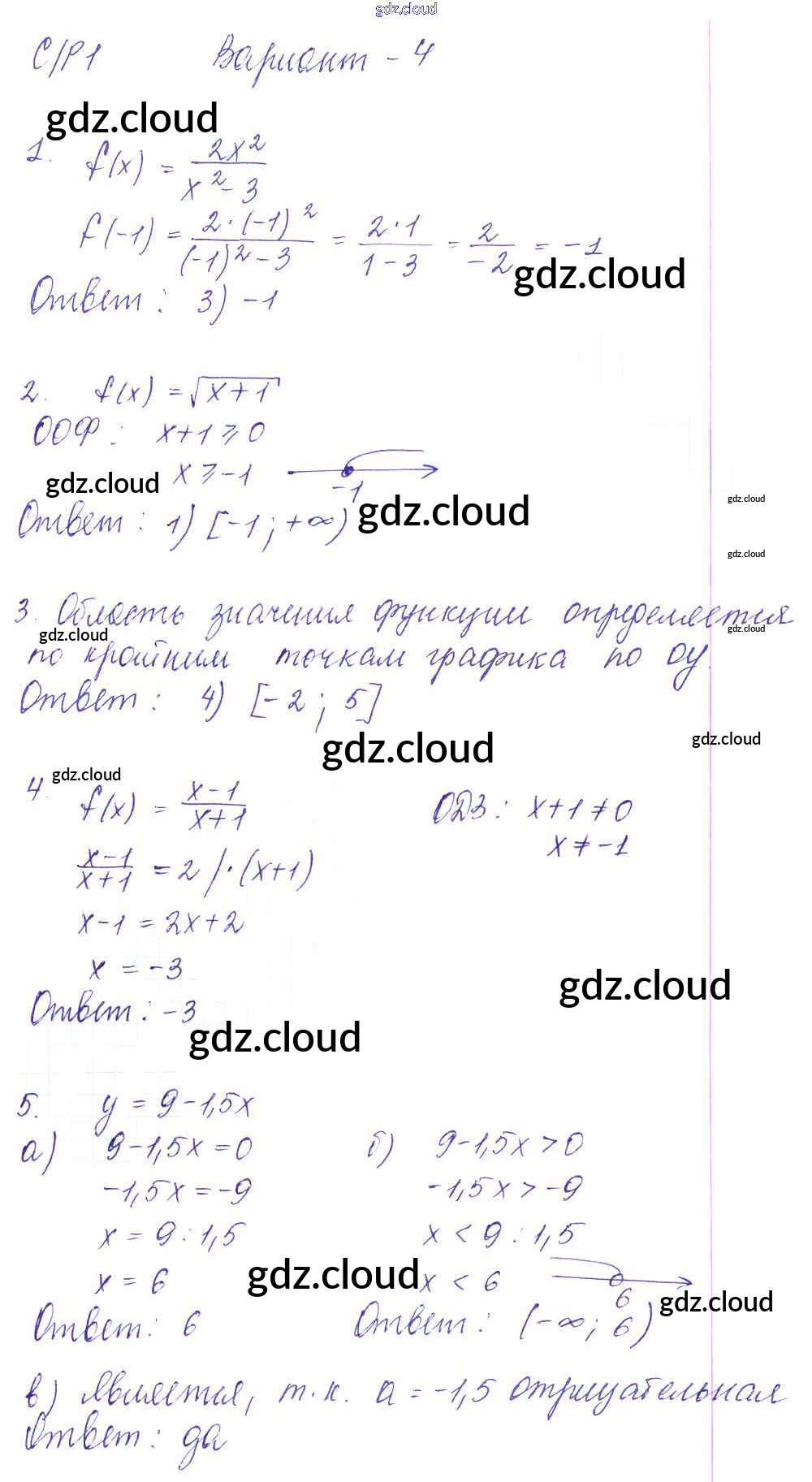 СР-1. Функции и их свойства Ответы к Самостоятельным работам по Алгебре 9 класс Самостоятельные и контрольные работы Глазков УМК Экзамен