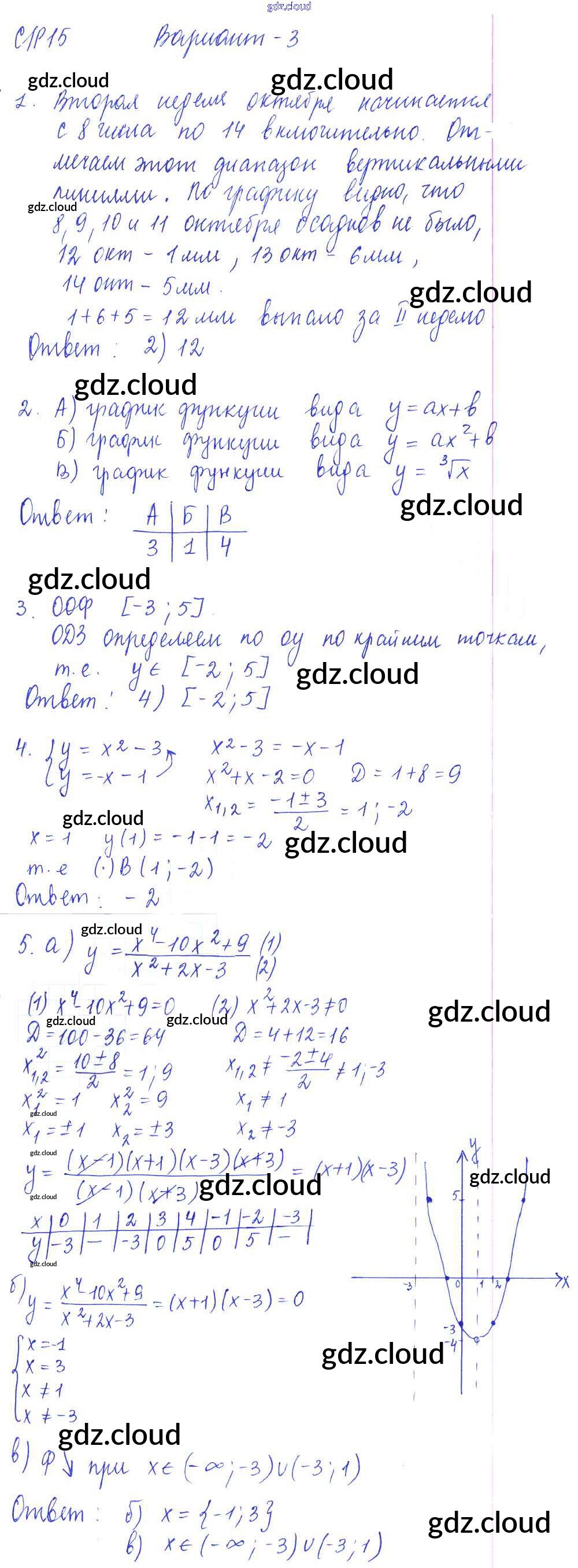 СР-15. Итоговое повторение. Функции и графики. Графическое решение уравнений и их систем Ответы к Самостоятельным работам по Алгебре 9 класс Самостоятельные и контрольные работы Глазков УМК Экзамен