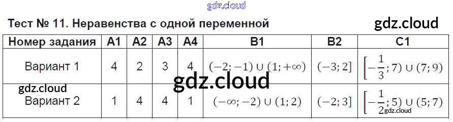 Ответ на задание Тест №11. Неравенства с одной переменной Контрольно-измерительные материалы (КИМ) Алгебра за 9 (девятый) класс Мартышова 2015