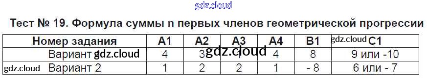Ответ на задание Тест №19. Формула суммы n первых членов геометрической прогрессии Контрольно-измерительные материалы (КИМ) Алгебра за 9 (девятый) класс Мартышова 2015