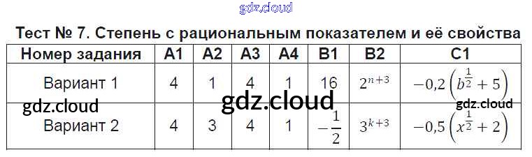 Ответ на задание Тест №7. Степень с рациональным показателем и её свойства Контрольно-измерительные материалы (КИМ) Алгебра за 9 (девятый) класс Мартышова 2015