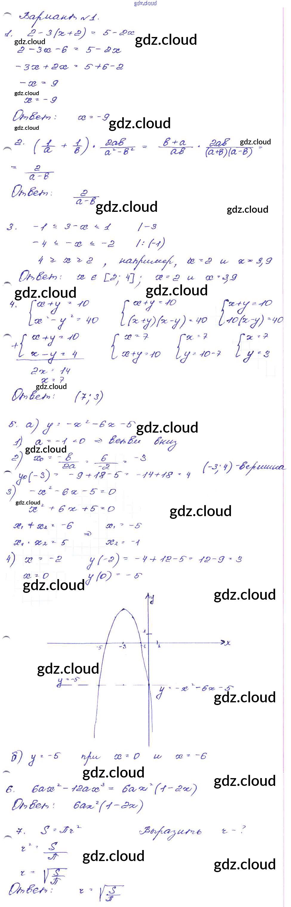 Ответ на задание Вариант-1 Сборник заданий Алгебра за 9 (девятый) класс Кузнецова, Бунимович, Пигарев, Суворова 2008
