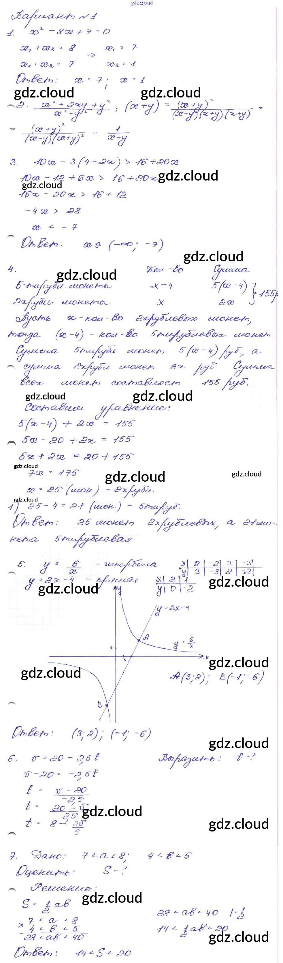 Ответ на задание Вариант-1 Сборник заданий Алгебра за 9 (девятый) класс Кузнецова, Бунимович, Пигарев, Суворова 2008
