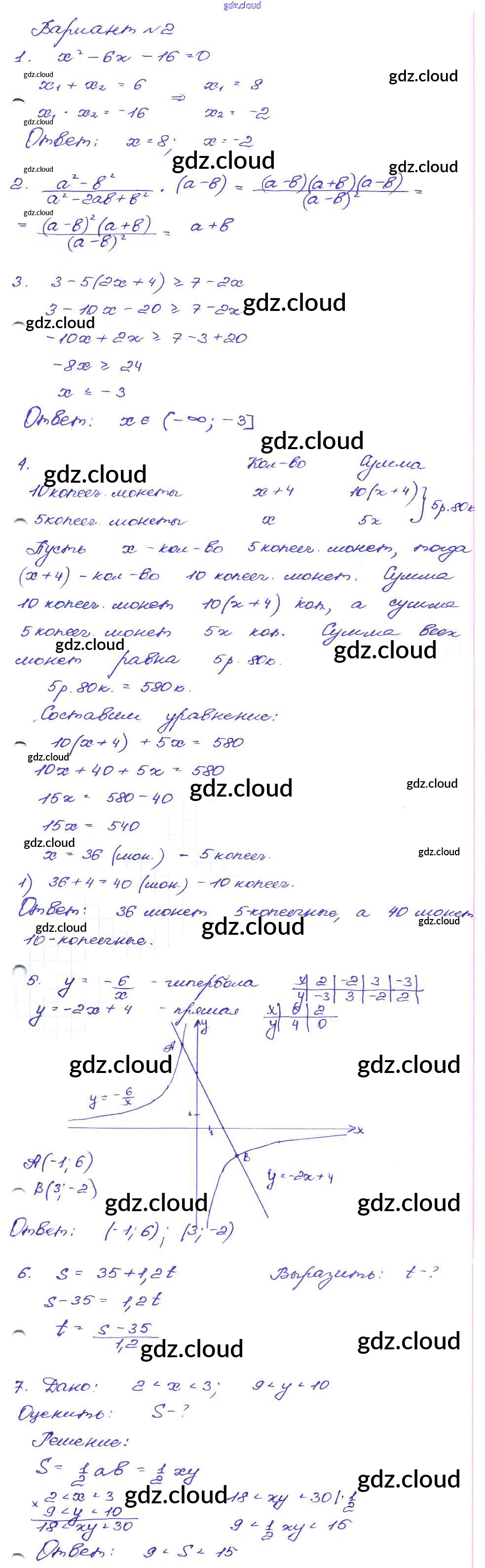 Ответ на задание Вариант-2 Сборник заданий Алгебра за 9 (девятый) класс Кузнецова, Бунимович, Пигарев, Суворова 2008