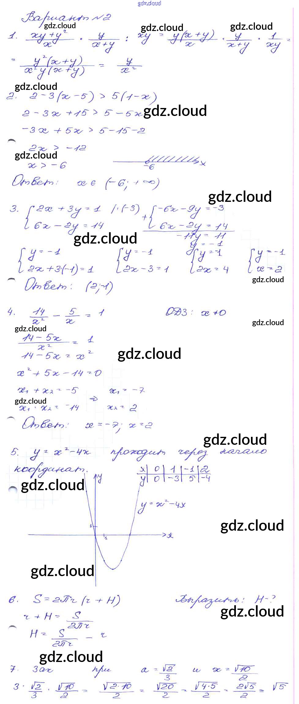 Ответ на задание Вариант-2 Сборник заданий Алгебра за 9 (девятый) класс Кузнецова, Бунимович, Пигарев, Суворова 2008