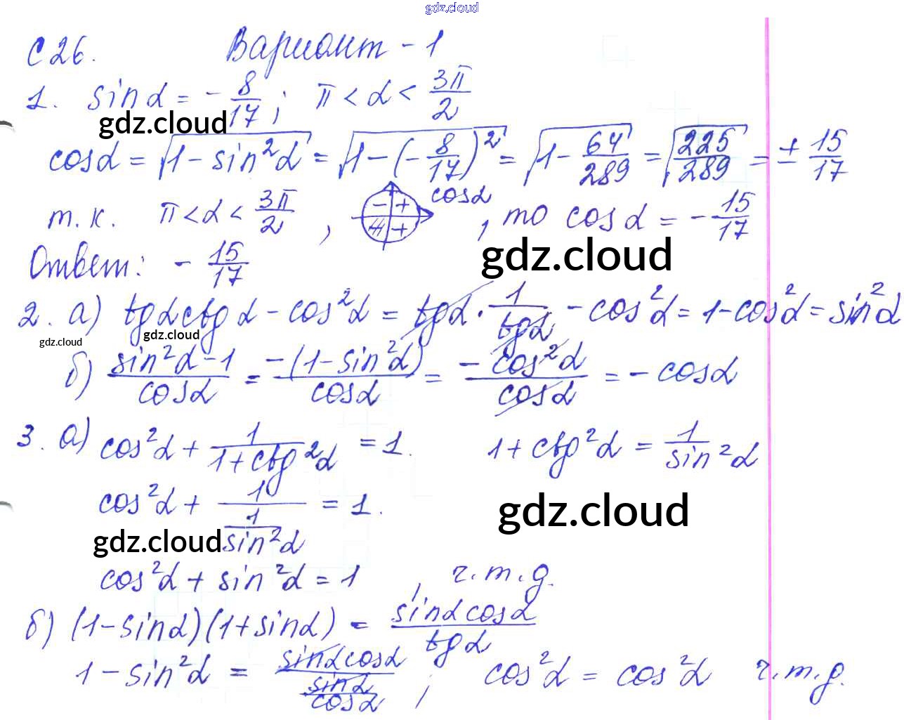 С-26. Тригонометрические тождества и их применение Ответы к Самостоятельным работам по Алгебре 9 класс Контрольные и самостоятельные работы Журавлев УМК Экзамен