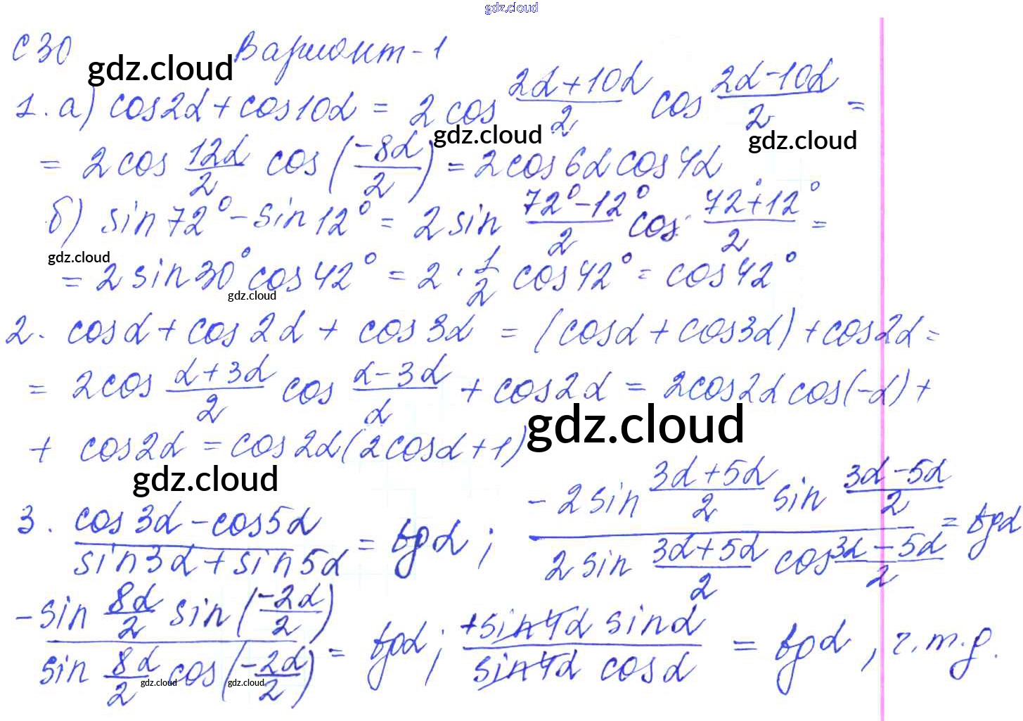 С-30. Формулы суммы и разности тригонометрических функций Ответы к Самостоятельным работам по Алгебре 9 класс Контрольные и самостоятельные работы Журавлев УМК Экзамен