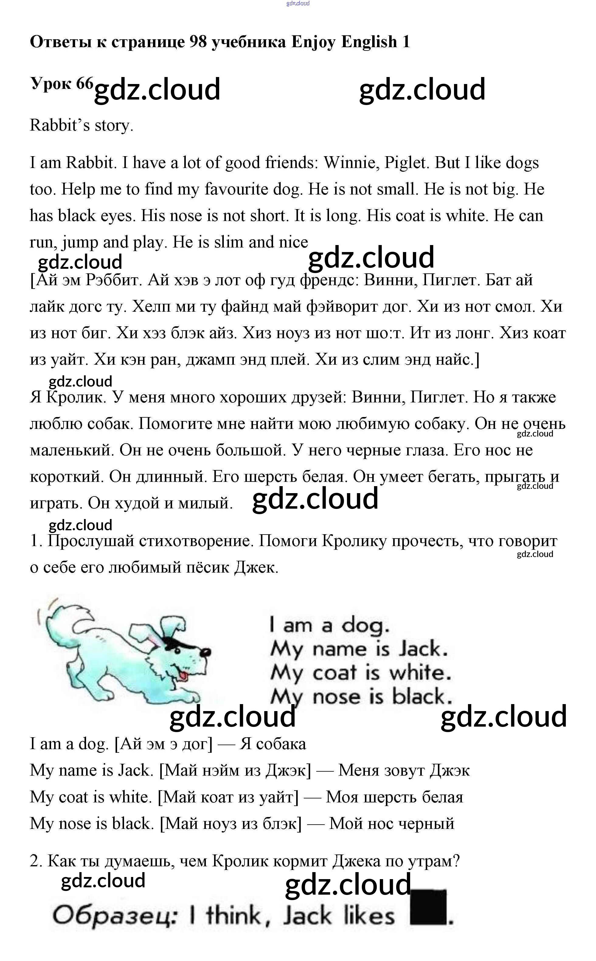 Ответ на задание 98 Учебник Английский язык за 1 (первый) класс Биболетова, Добрынина, Ленская Enjoy English 2010 онлайн и без номера телефона.