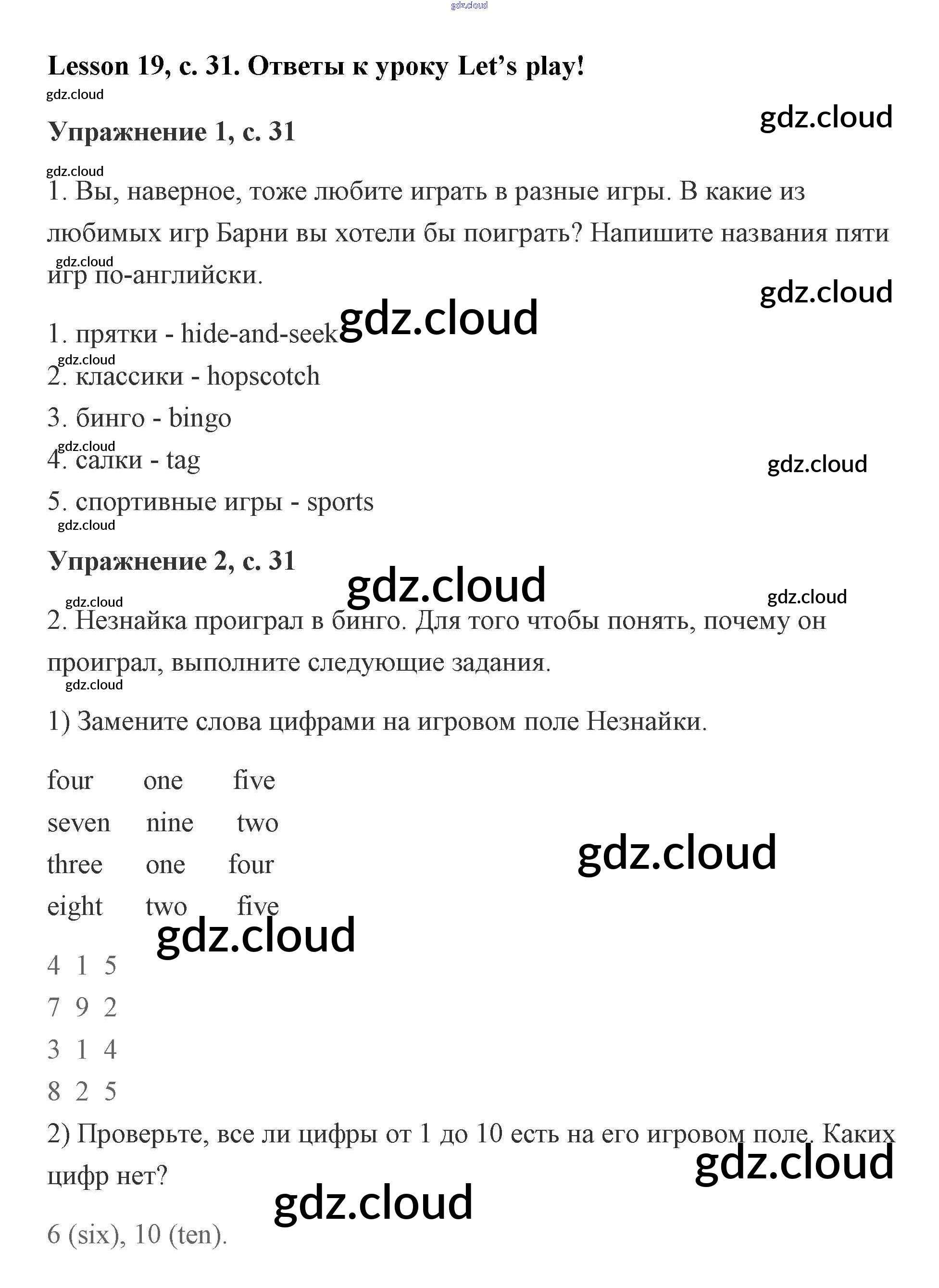 Ответы. Lesson 19. Let’s play! по Английскому языку 2 класс Рабочая тетрадь Кузовлев Просвещение