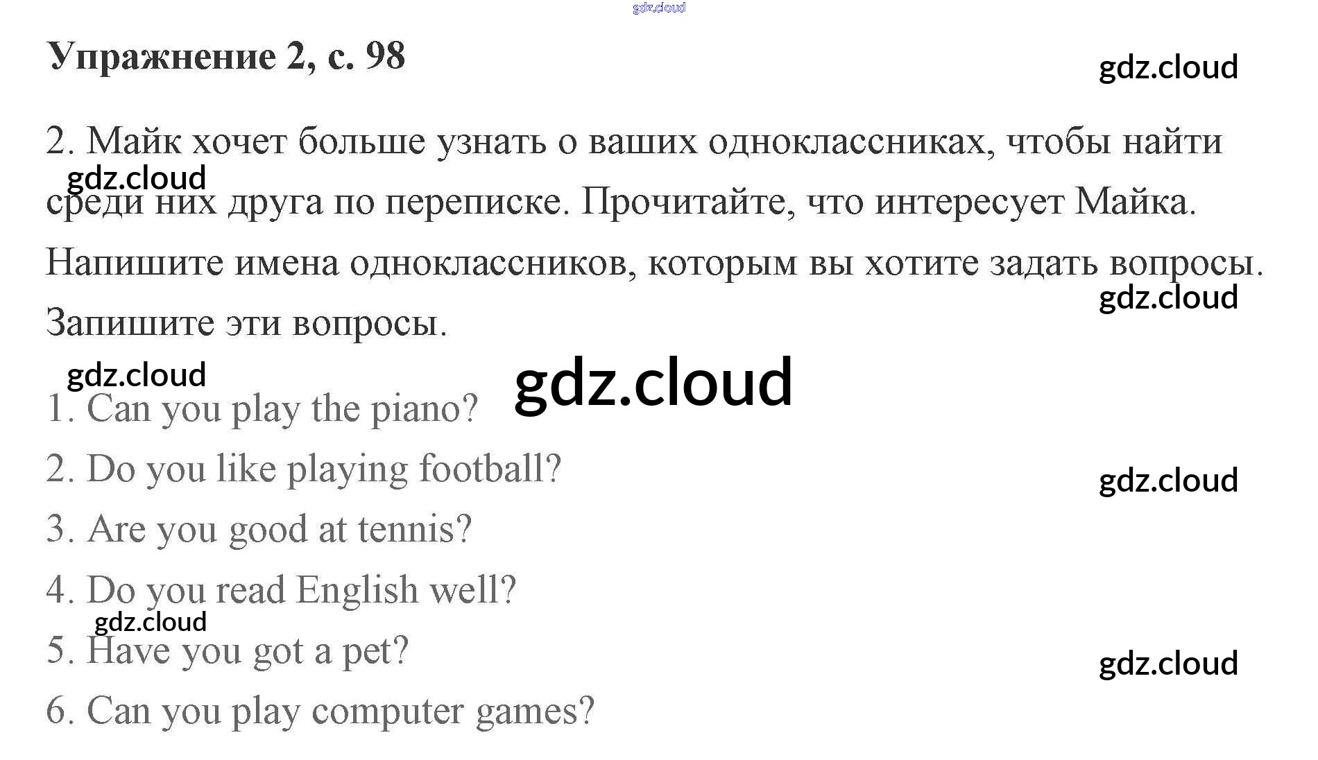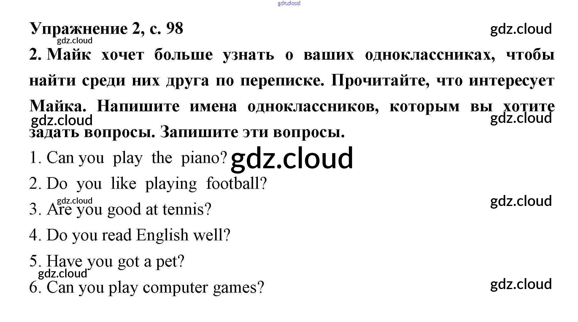 Ответ на задание 98 Рабочая тетрадь Английский язык за 2 (второй) класс Кузовлев, Перегудова, Пастухова 2011