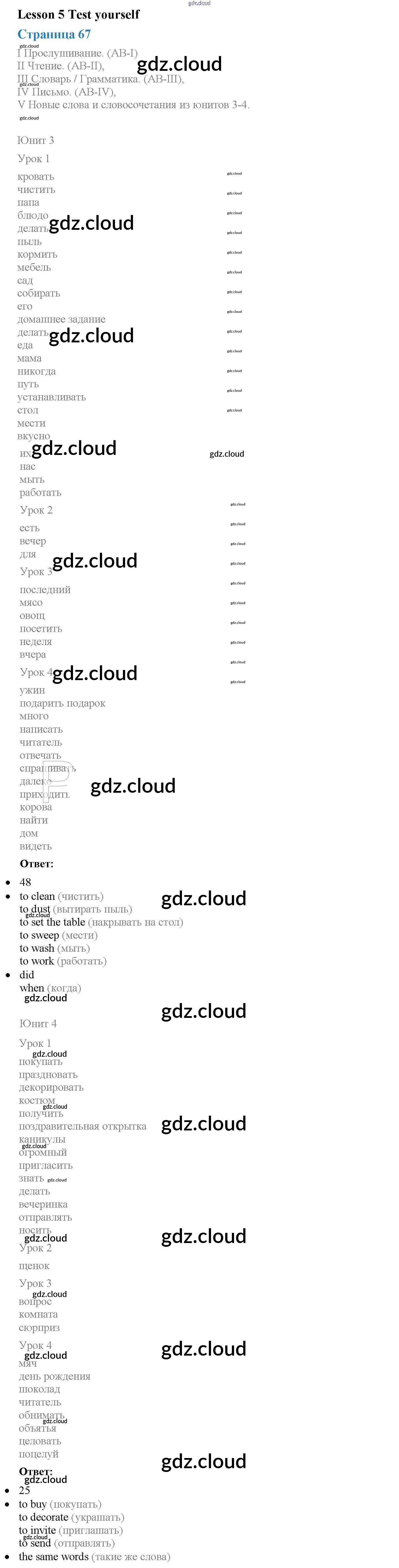 Ответ на задание Lesson 5 (страницы 67 – 68) Учебник Английский язык за 3 (третий) класс Кузовлев, Лапа, Костина 2016 Часть 1, 2