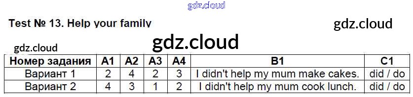 Ответ на задание Тест №13. Help your family Контрольно-измерительные материалы (КИМ) Английский язык за 4 (четвертый) класс Кулинич 2018