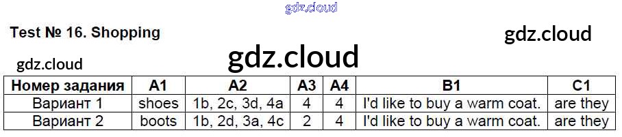 Ответ на задание Тест №16. Shopping Контрольно-измерительные материалы (КИМ) Английский язык за 4 (четвертый) класс Кулинич 2018