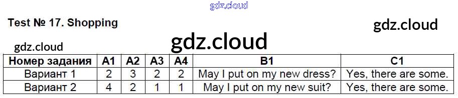 Ответ на задание Тест №17. Shopping Контрольно-измерительные материалы (КИМ) Английский язык за 4 (четвертый) класс Кулинич 2018