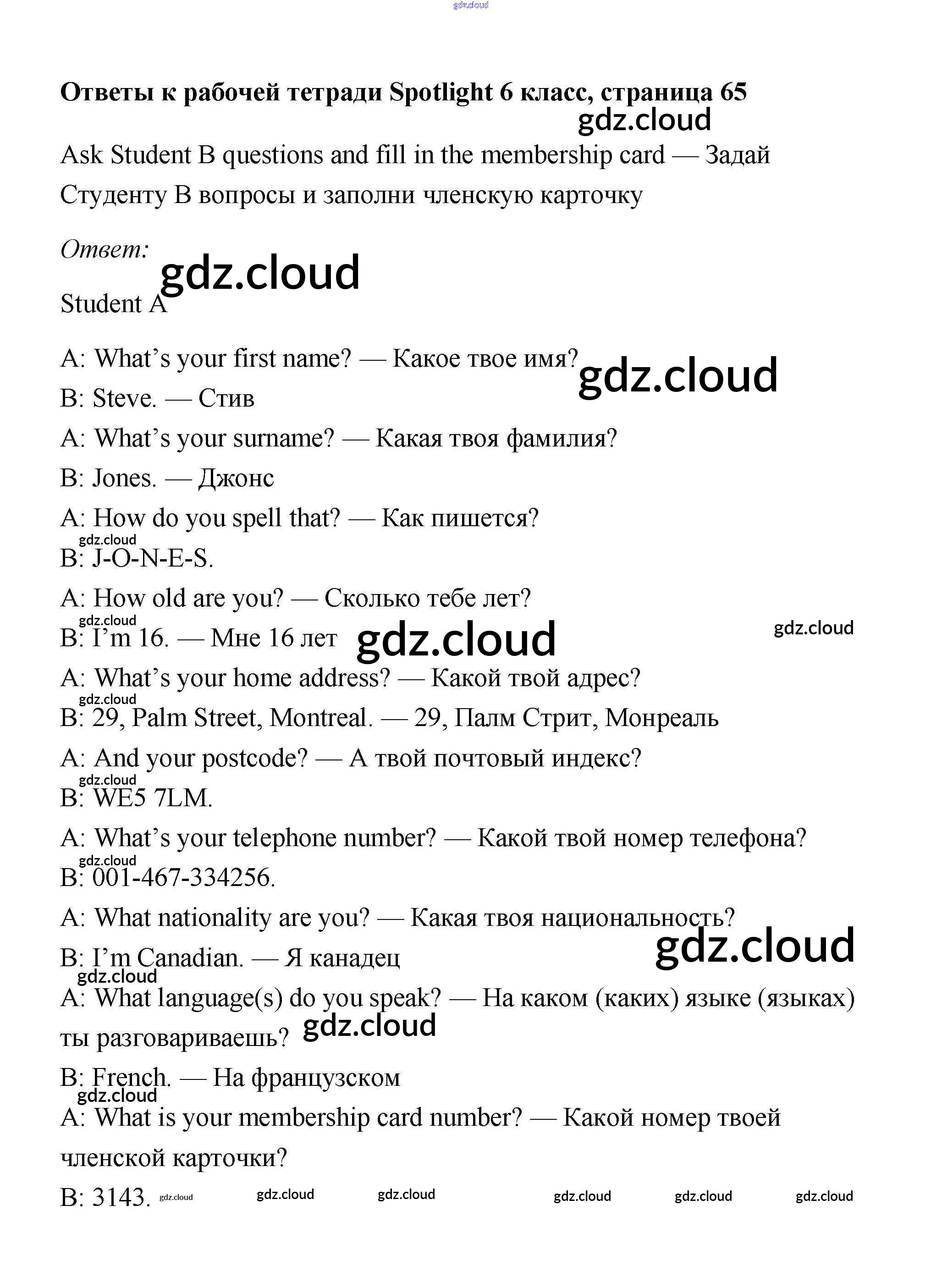 Ответ на задание 65 Рабочая тетрадь Английский язык  за 6 (шестой) класс Эванс, Дули, Подоляко, Ваулина Spotlight  2011
