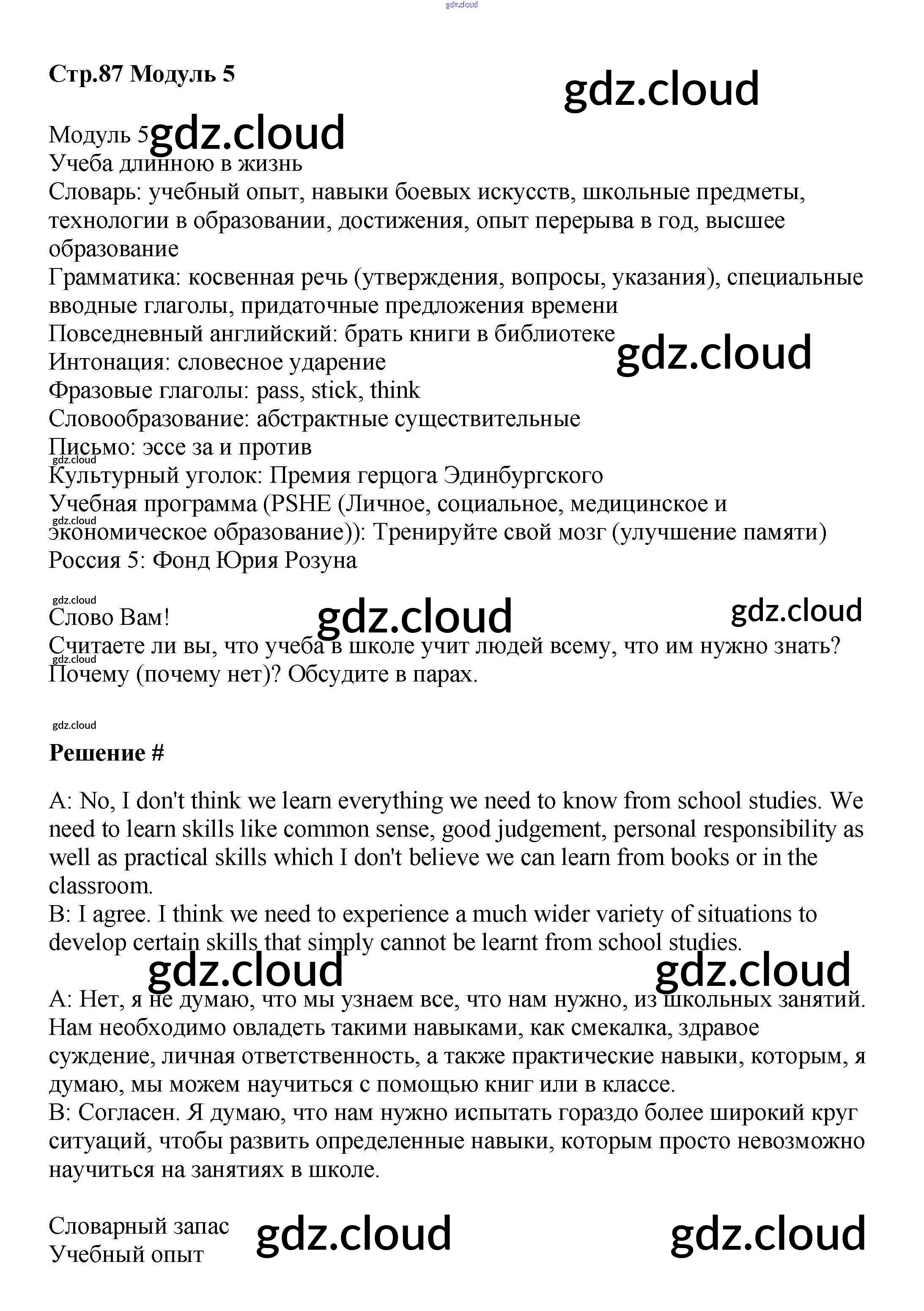 Ответ на задание стр.87 Учебник Английский язык  за 8 (восьмой) класс Баранова, Дули, Эванс, Копылова, Мильруд Starlight Углубленный уровень 2016